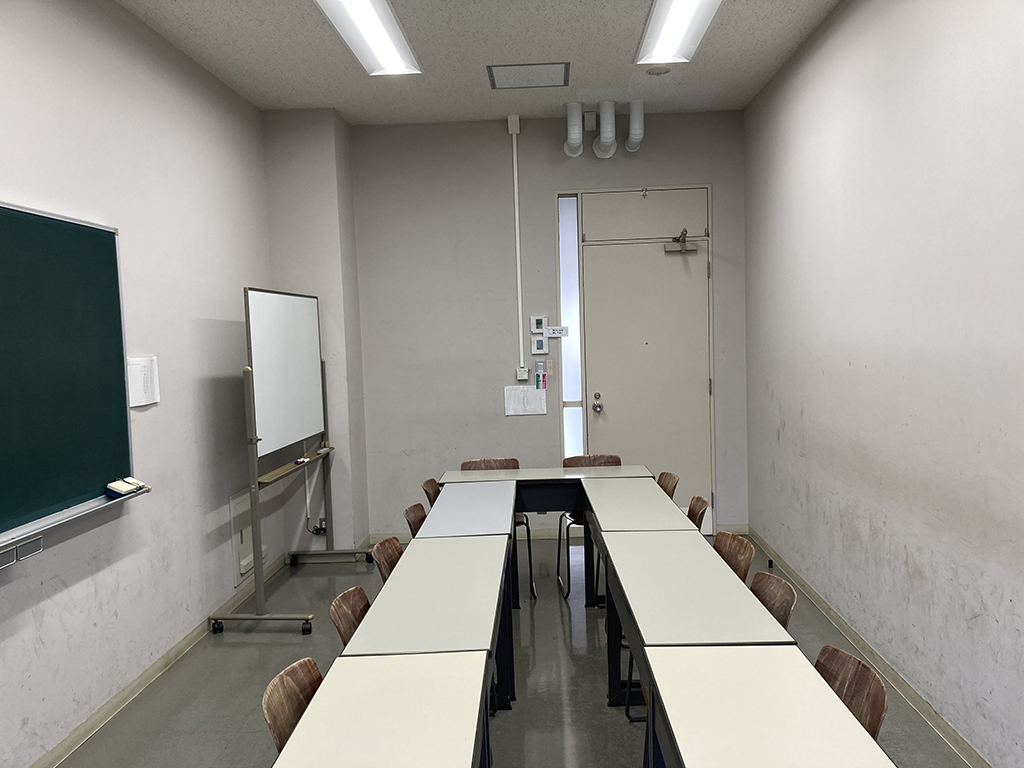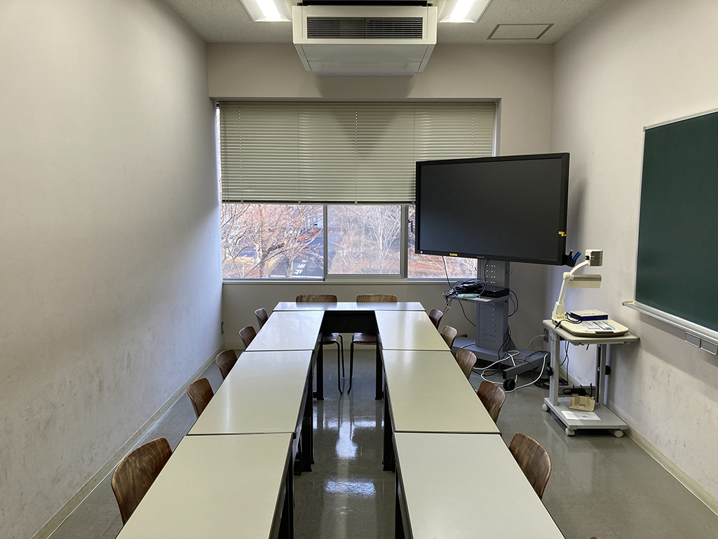 標準タイプの小教室です。65型タッチディスプレとBD/DVDプレーヤーが設置されています。